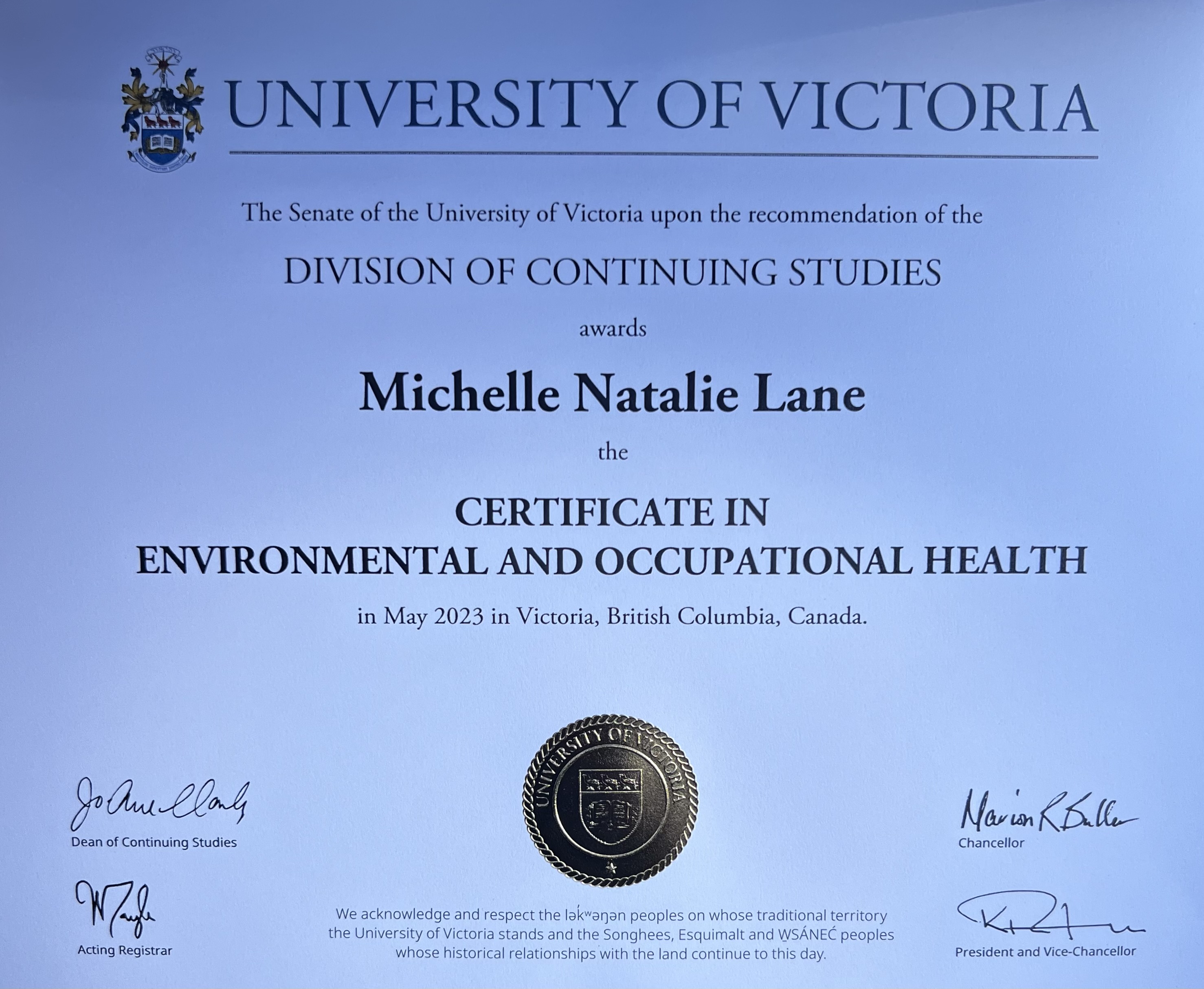 | Certificate in Environmental and Occupational Health | University of Victoria | N/A | May 01, 2023 | May 04, 2026 | View | ||